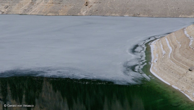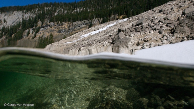 Als Kind war ich mit meinen Eltern am Gosausee und kann mich daran erinnern, dass vor allem die Gosaulacke extrem klares Wasser hat. Für einen Unterwasserfotografen ein Traum. In der Hoffnung, noch etwas Eis auf dem See zu haben, machte ich mich im März auf den Weg nach Oberösterreich. Leider war es für die Gosaulacke zu früh im Jahr. Sie war fast ausgetrocknet und vollkommen mit Eis und Schnee bedeckt. Am vorderen Gosausee fand ich jedoch, was ich mir erhofft hatte - eine eisfreie Bucht.